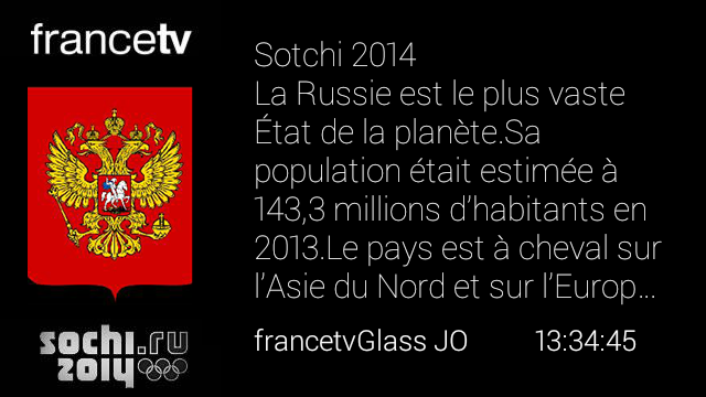 Il suffit de porter une paire de ces Google Glass pendant les directs JO de France 2 ou France 3 : automatiquement s’affichent en temps réel des informations pertinentes sur les épreuves en cours (fiche d’un sportif, carte d’une ville ou d’un pays cités, palmarès de l’équipe en train de disputer un match etc).