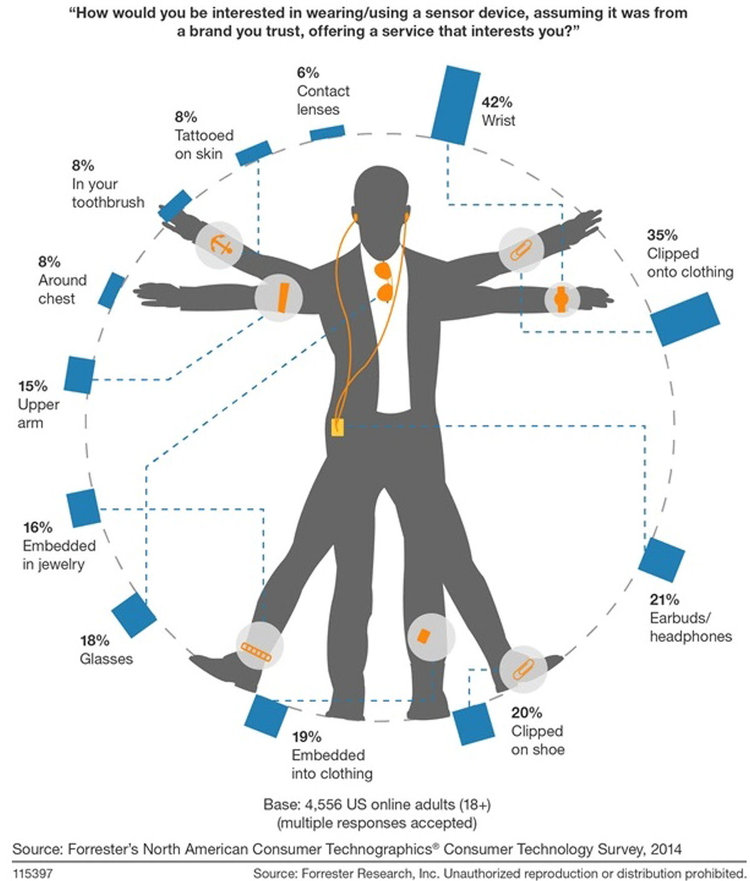 42% des personnes interrogées ont répondu être intéressées par le port d’un objet connecté autour du poignet. Comprenez un bracelet connecté ou une montre connectée.