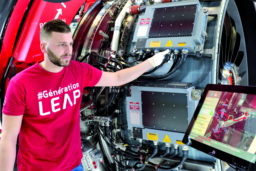 Sur l’écran, le moteur réel apparaît en gris, le câble virtuel à brancher en rouge, agrémenté d’instructions de montage. Face à l’imposant engin de deux mètres de largeur en cours d’assemblage, l’opérateur vérifie en temps réel qu’il fixe le harnais, un ensemble de câbles, au bon endroit. Une aide décisive pour ce qui constituera, in fine, un inextricable puzzle de 25 000 éléments. La réalité augmentée a fait irruption chez Safran en décembre 2016. Et pas n’importe où : au cœur des deux lignes d’assemblage du site historique de Villaroche (Seine-et-Marne), chargées de produire le moteur Leap, qui équipera les Airbus A 320neo et les Boeing 737 MAX. La réalité augmentée doit permettre au groupe de réaliser une montée en cadence de la production jamais vue dans l’histoire de l’aéronautique. À savoir, parvenir, d’ici à l’horizon 2020, à sortir 1 000 Leap par an, contre une centaine d’unités en 2016.