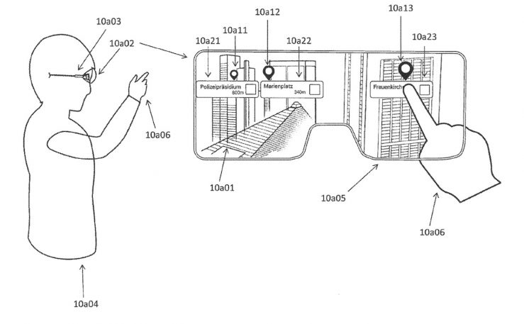 Le brevet contient des informations sur une méthode pour mettre en avant des points d’intérêt dans une vue d’un environnement réel depuis un appareil mobile. Le brevet inclut le schéma d’une personne avec ce qui semble être des lunettes connectées qui ont des informations affichées sur l’écran, dont le nom des bâtiments autour d’elle. Un autre dessin montre la possibilité d’avoir davantage de détails sur un bâtiment en particulier depuis son iPhone.